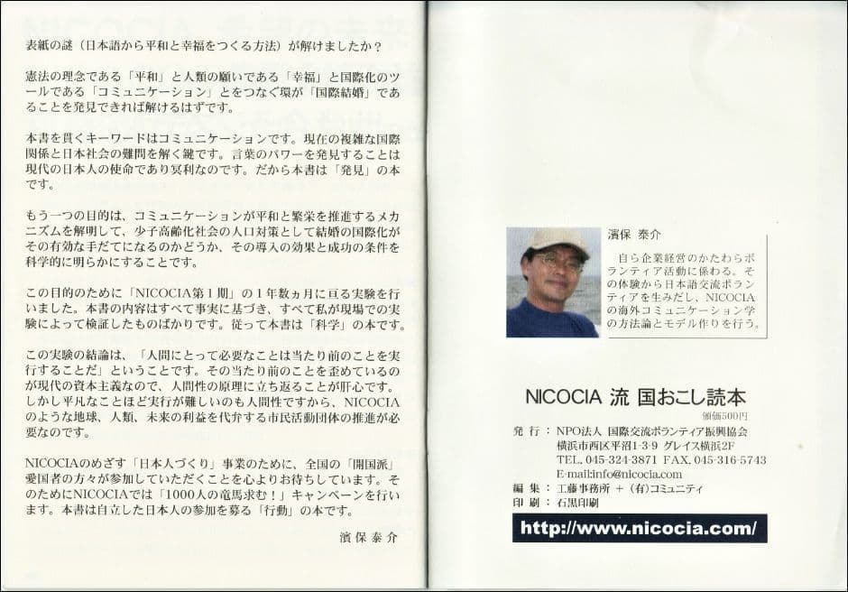 To build "NICOCIA Phase 2," we will conduct a nationwide publicity campaign seeking "1000 Ryoma" from all over the country! We sincerely await the participation of international-minded "patriots" like you in revitalizing our country. This book is a call for action and a book of "patriotism."